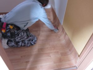 床のクッションフロアはあらかじめ採寸してカットした1枚を貼ります。