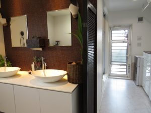 洗面台の横の通路はお風呂やバルコニーへ抜けられます。