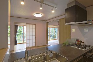 屋内からも、縁側とお庭の様子がみられるようにキッチンを配置し、