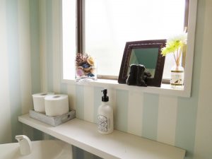 天井はストライプの壁紙と色を合わせて水色にしました。