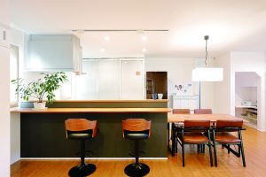 キッチンの横にダイニングテーブルが並ぶように設計された奥様。