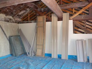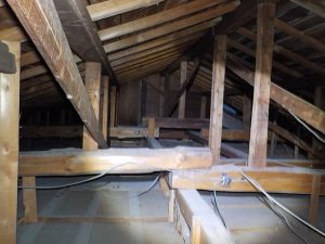 長い間、お部屋としては使われていない様子でした。 また屋根裏では、西側から東側にいくにつれて、躯体で使われている木材が新しくなり、