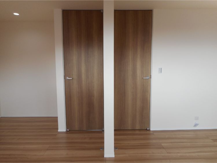 しばらくは広々1部屋として使い、将来的に2部屋に仕切れる子供室。 建具は2箇所用意しています。